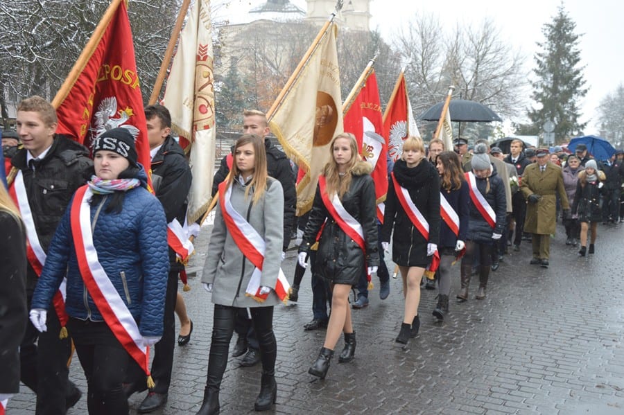 Z kościoła delegacje, poczty sztandarowe i mieszkańcy przy śnieżnej, choć i nieco deszczowej pogodzie, przemaszerowali kilkaset metrów pod pomnik T. Kościuszki. Tam okolicznościowe przemówienie wygłosił Janusz Kloc – wiceprzewodniczący Rady Powiatu we Włodawie. Po uroczystym złożeniu wieńców, kwiatów i wiązanek pod pomnikiem T. Kościuszki, w sali włodawskiego kina odbyła się akademia z okazji Narodowego Święta Niepodległości. Przygotowali ją uczniowie ZSZ nr 1 i II LO pod kierunkiem Anny Łukaszewicz i Mariusza Czuja. Młodzież zaprezentowała widowisko słowno-muzyczne nawiązujące do wydarzeń z 1918 r.