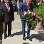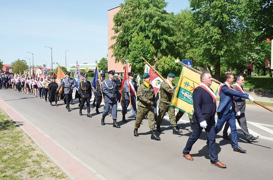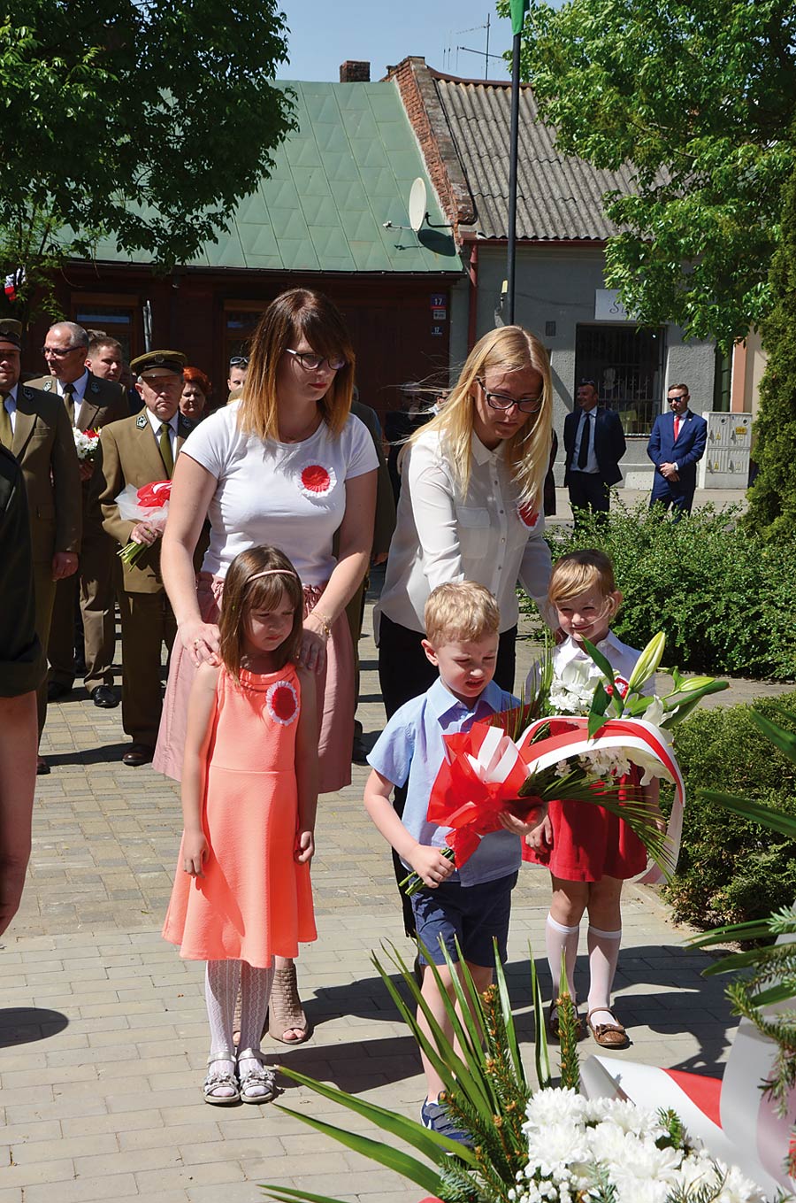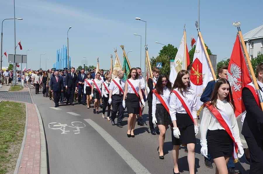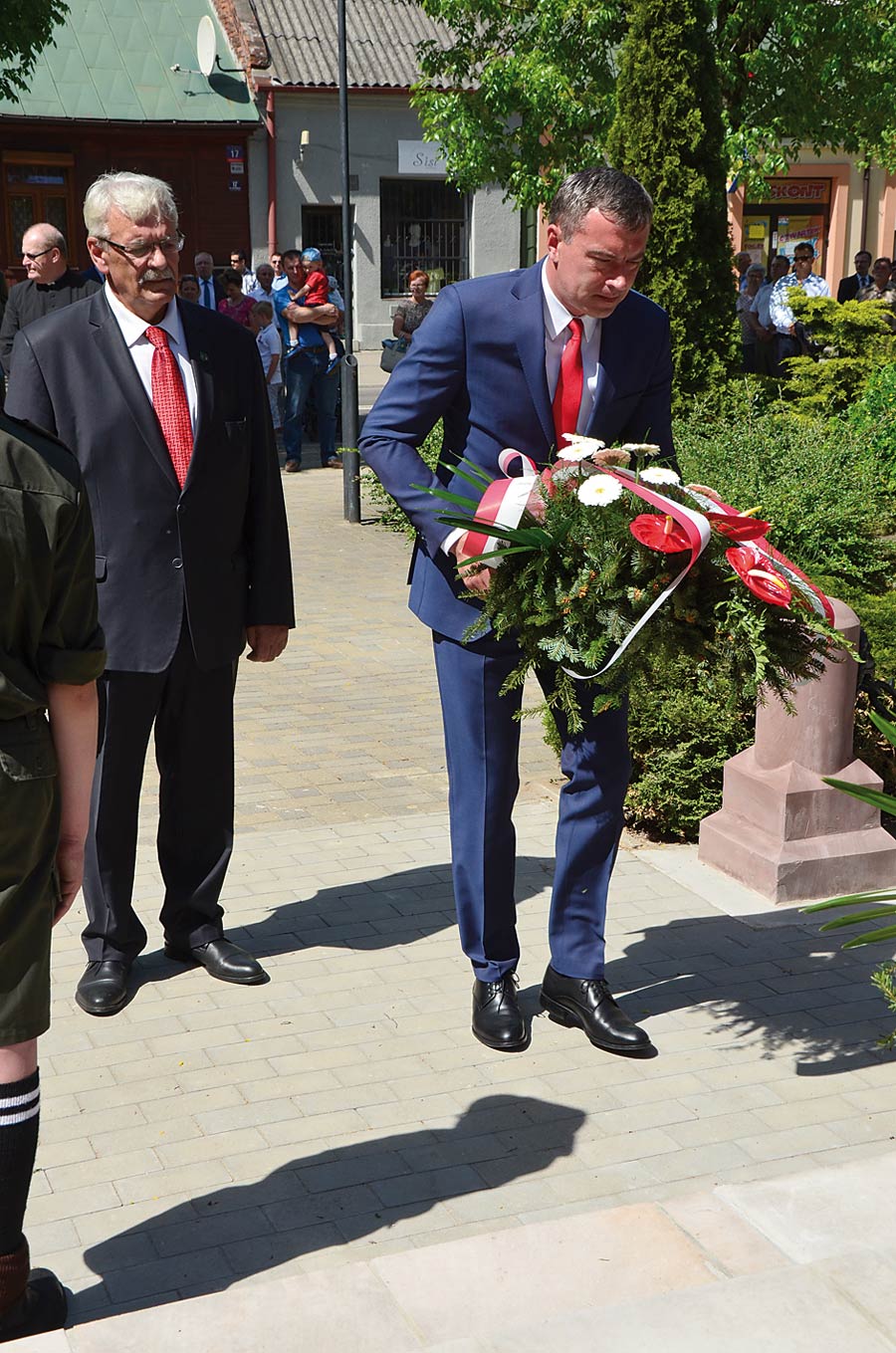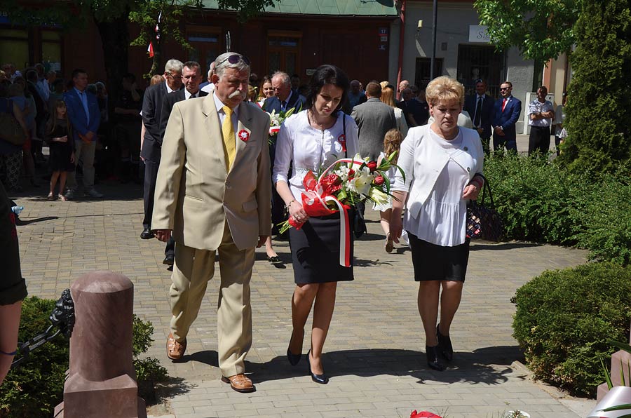 Po mszy nastąpił przemarsz pocztów sztandarowych i delegacji przed pomnik Tadeusza Kościuszki, gdzie okolicznościowe przemówienie wygłosił przewodniczący rady miejskiej – Tomasz Korzeniewski. Następnie delegacje złożyły wieńce i wiązanki pod pomnikiem. Wśród nich jako jedna z pierwszych złożyła wieniec delegacja powiatu pod przewodnictwem starosty Andrzeja Romańczuka. Ogółem radnych powiatowych naliczyliśmy ośmioro (na 17), zaś miejskich – sześcioro (na 15).