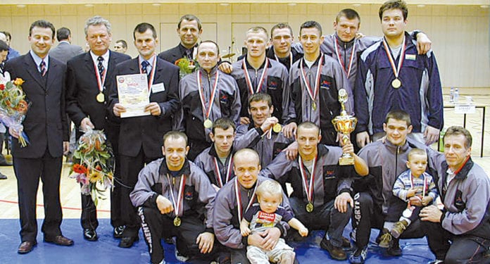 Początek ligowych rozgrywek nie był dla chełmskiego klubu udany. Obrońcy tytułu wicemistrza Polski nieoczekiwanie przegrali w Warszawie z Legią 2:5, choć na „papierze” wydawało się, że wygrają go 4:3. Początek meczu nie zapowiadał przegranej, bo w najniższej kategorii wagowej Piotr Jabłoński zgodnie z planem pewnie pokonał Jarosława Pyzarę. W drugim pojedynku jego bardziej utytułowany brat Dariusz Jabłoński walczył z dużo młodszym od siebie Łukaszem Niewiadomskim i był faworytem tej walki. Ambitny zawodnik gospodarzy nie skapitulował przed utytułowanym rywalem i szybko zaskoczył go, wykonując efektowny „wózek”. Przewaga nieopierzonego zapaśnika Legii błyskawicznie urosła do siedmiu punktów i w tym momencie Jabłoński zdał sobie sprawę, że wygrać będzie ciężko i wyraźnie spasował. Ale nie tylko on doznał zaskakującej porażki. W kolejnym starciu w wadze do 66 kg Sylwester Charzewski (na zdjęciu z lewej) uległ Marcinowi Panasiukowi, który zastąpił na macie kontuzjowanego mistrza olimpijskiego Włodzimierza Zawadzkiego. Trener gości, Andrzej Głąb miał pretensje do sędziego za nieco „gospodarskie” prowadzenie pojedynku, ale nic to nie zmieniło. Po tej porażce wiadomo już było, że Cement Gryf tego pojedynku nie wygra. Co prawda Radosław Truszkowski w wadze do 74 kg zrobił swoje i dobrą postawą w ostatniej rundzie pokonał Pawła Szustka doprowadzając do remisu 2:2, ale w kolejnych walkach górą byli legioniści. W kategorii wagowej do 84 kg goście nie wystawili zawodnika i Marek Szustek zdobył punkty walkowerem. W najcięższych kategoriach wyraźne zwycięstwa odnieśli zapaśnicy Legii Michał Flis i Marek Mikulski. Wydawało się, że porażka 2:5 z Legią przekreśli szanse Cementu Gryf Chełm na finał mistrzostw Polski. W rewanżu w Chełmie gospodarze wygrali 4:3, a punkty dla chełmian zdobyli: Piotr Jabłoński, Marek Okoński, Radosław Truszkowski i Sebastian Czerwiński. Ponieważ Legia po drodze przegrała jeszcze jeden mecz, ostatecznie to chełmski zespół, po wygranych bojach z AKS Piotrków Trybunalski i PTC Pabiance zajął pierwsze miejsce w grupie „B” i awansował do finału.