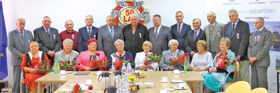 50 lat pożycia świętowali: Adam i Alfreda Czerniakowie, Franciszek i Kamilla Ferenc, Józef i Celina Jakubiakowie, Krzysztof i Maria Kostrzanowscy, Kazimierz i Zofia Niećko, Jan i Czesława Nożyńscy, Eugeniusz i Alicja Prościńscy, Stanisław i Krystyna Śleboda oraz Stanisław i Maria Waręccy. Uroczystość odbyła się w ciepłej atmosferze. W imieniu samorządu życzenia przybyłym parom złożył Janusz Korczyński – wójt gminy Krasnystaw, który w swoim wystąpieniu mówił między innymi o istocie małżeństwa i jego wpływie na kształtowanie młodego pokolenia. W święcie wzięli też udział: starosta krasnostawski Janusz Szpak, przewodniczący rady gminy Krasnystaw Mirosław Berbeć oraz Renata Gałan – kierownik Urzędu Stanu Cywilnego w gminie Krasnystaw. Medale za długoletnie pożycie małżeńskie przyznawane są przez prezydenta Rzeczypospolitej Polskiej. (kg)