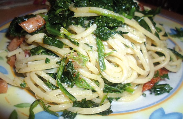 Makaron ugotować al dente. Jajka sparzyć, wbić do miseczki i rozmącić ze śmietaną, parmezanem, szczyptą soli i pieprzu oraz gałki muszkatołowej. Rozmrożony szpinak (ilość wedle uznania) podsmażyć na maśle z rozgniecionym ząbkiem czosnku. Wyjąć, a na patelni po szpinaku podsmażyć pokrojony w kostkę boczek (można dodać odrobinę masła w razie potrzeby). Gdy będzie złocisty, wlać chochlę wody, w której się gotował makaron, dorzucić szpinak, a na końcu sam makaron. Przesmażyć minutę i wlać masę jajeczną (na małym ogniu lub na chwilę zdjąć patelnię z ognia). Trzymać na ogniu, aż sos zgęstnieje, do połączenia się składników – nie za długo, by jajka się nie ścięły.