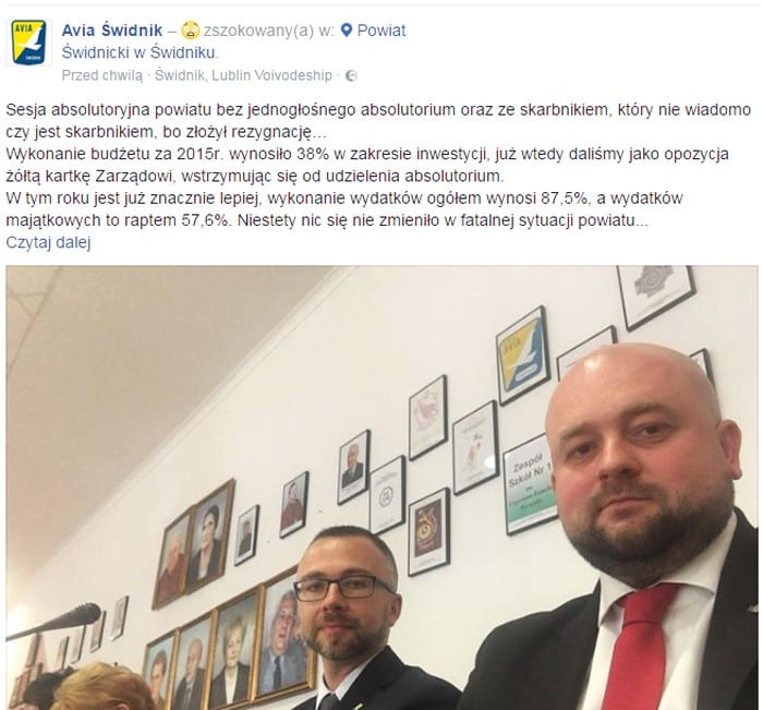 „Dziś (30.05) ok. godziny 16.45 klub AVIA Świdnik, na czele którego stoi powołany w kontrowersyjnych okolicznościach i bez konkursu radny powiatu świdnickiego z klubu PiS – Porozumienie Prawicy: Łukasz Reszka, opublikował na oficjalnym profilu klubu komentarz dotyczący bieżącej polityki w powiecie. Nie komentujemy treści, bo nie warto tego komentować. Jesteśmy natomiast zniesmaczeni i zszokowani wykorzystywaniem klubu sportowego Avia Świdnik do walki politycznej w tak bezczelny, bezprecedensowy sposób” – napisali w e-mailu do redakcji członkowie stowarzyszenia.