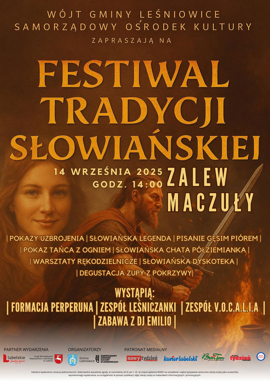 14 września br. od godz. 14.00 nad zalewem „Maczuły” w Horodysku (gmina Leśniowice) zaplanowano Festiwal Tradycji Słowiańskiej. Uczestnicy imprezy przeniosą się w czasy dawnych Słowian. Czekają ich następujące atrakcje: pokazy uzbrojenia, słowiańska legenda i pisanie gęsim piórem, pokaz tańca z ogniem, słowiańska chata półziemianka, warsztaty rękodzielnicze, degustacja zupy z pokrzywy. W programie także słowiańska dyskoteka. Na scenie wystąpią: Formacja Perperuna, Zespół Leśniczanki, Zespół V.O.C.A.L.I.A. Szykuje się też zabawa z DJ Emilio. Na imprezę wstęp wolny.