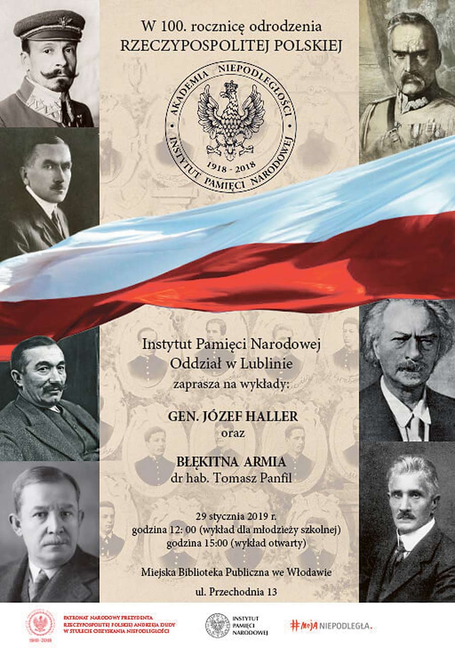 Tym razem z wykładami „Gen. Józef Haller” oraz „Błękitna Armia” wystąpi dr hab. Tomasz Panfil. Spotkania odbędą się w sali konferencyjnej Miejskiej Biblioteki Publicznej we Włodawie: o godz. 12:00 – wykład dla młodzieży szkolnej, godz. 15:00 – wykład otwarty dla wszystkich zainteresowanych udziałem w spotkaniu.