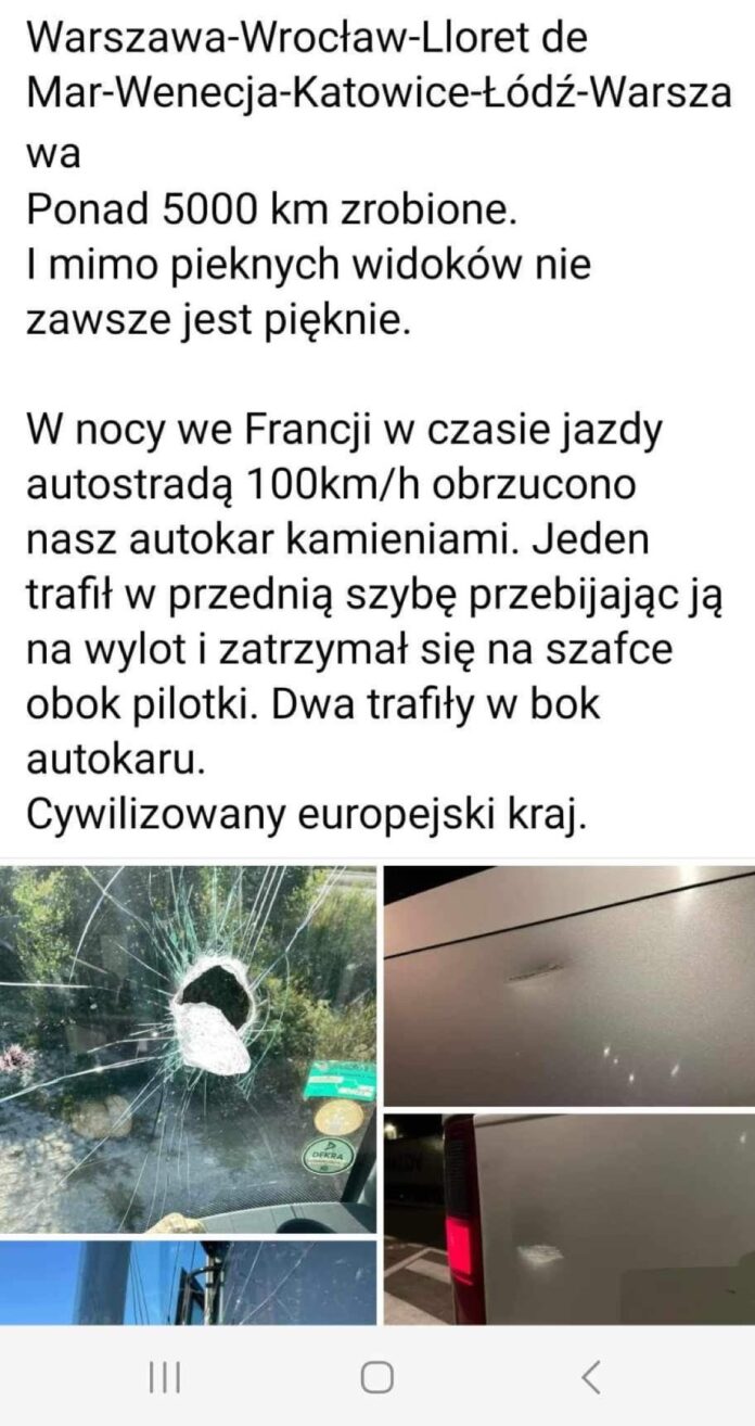 W minioną sobotę poinformował o tym na swoim profilu na Facebooku jeden z chełmian biorących udział w wycieczce: –„Warszawa-Wrocław-Lloret de Mar-Wenecja- Katowice-Łódź-Warszawa. Ponad 5000 km zrobione. I mimo pięknych widoków nie zawsze jest pięknie. W nocy we Francji w czasie jazdy autostradą100 km/h obrzucono nasz autokar kamieniami. Jeden trafił w przednią szybkę przebijając ją na wylot i zatrzymał się na szafce obok pilotki. Dwa trafiły w bok autokaru. Cywilizowany europejski kraj” – napisał na FB.