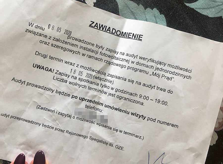 „Zawiadomienie” – przykuwa od razu uwagę napis wytłuszczoną czcionką na górze czarno-białej ulotki, którą mieszkaniec Żółtaniec znalazł w ubiegły poniedziałek w swojej skrzynce pocztowej. Na kartce nie ma żadnego logotypu, pieczątki czy choćby nazwiska nadawcy, a jedynie sucha informacja o tym, że na początku maja były prowadzone zapisy na audyt weryfikujący możliwości związane z założeniem instalacji fotowoltaicznej w domach jednorodzinnych oraz szeregowych w ramach rządowego programu „Mój Prąd”. Jest też podany kolejny termin wraz z godzinami zapisów na spotkania oraz zaznaczeniem, że wizytę należy wcześniej umówić telefonicznie. Podanego w ogłoszeniu telefonu nikt jednak nie odbiera.