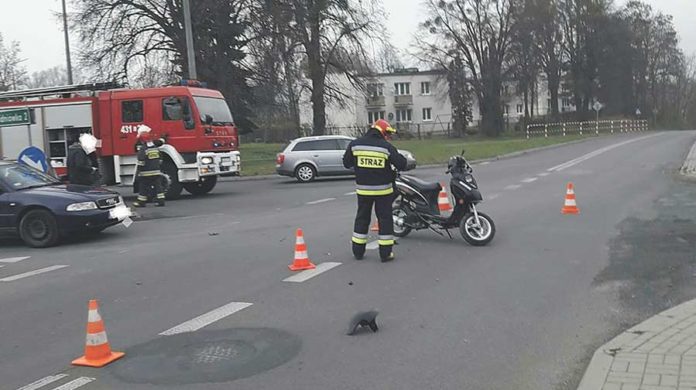 Doszło do zderzenia obu pojazdów, wskutek którego 23-latek upadł na jezdnię. – Gdy przybyliśmy na miejsce, kierowcy skutera już nie było, pojechał karetką do szpitala – opowiada z kolei Tomasz Wesołowski z krasnostawskiej straży pożarnej. Na szczęście okazało się, że obrażenia, jakich doznał mieszkaniec gminy Izbica, nie są groźne. Kierowca Audi został ukarany mandatem. (k, fot. OSP KSRG Izbica)