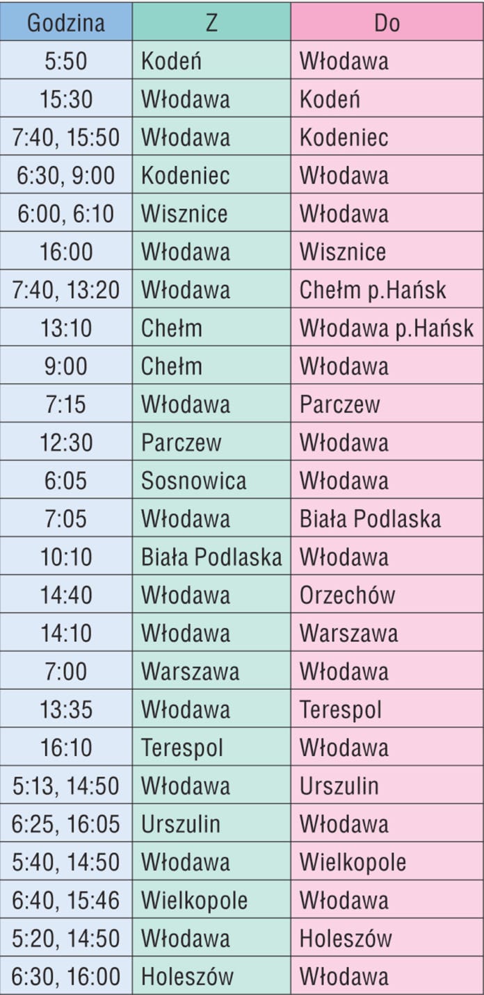 Chełmski PKS na zasadzie dzierżawy przejął 10 autobusów, część kierowców i warsztat mechaniczny. Rozmowy z Trans-Marem i jeszcze jednym przewoźnikiem wciąż trwają. Firmy te chcą przejąć połączenia oraz kierowców. Bilety na wszystkie połączenia pasażerowie będą mogli kupić w biurze podróży „ABC” przy ul. Przechodniej 22 we Włodawie. Niżej prezentujemy rozkład jazdy autobusów kursujących w powiecie włodawskim. (bm)