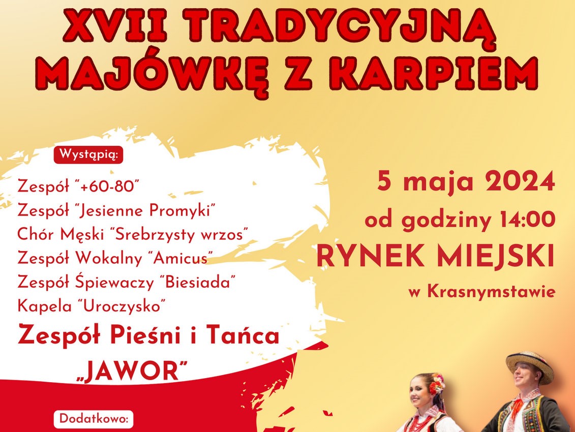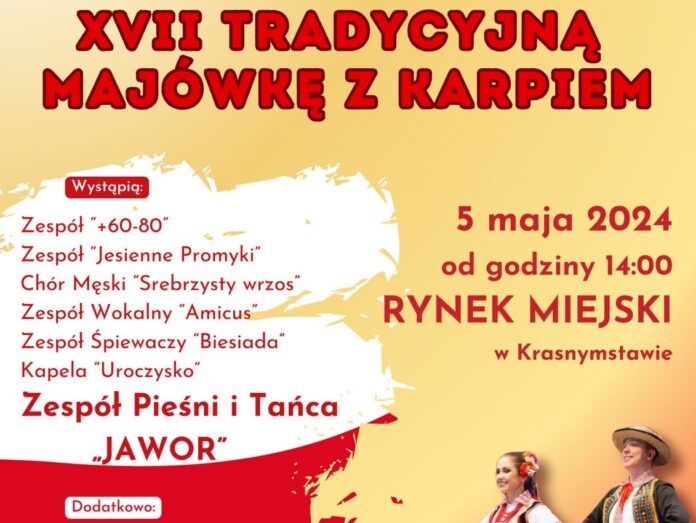 W niedzielę, 5 maja, Burmistrz Krasnegostawu i Krasnostawski Dom Kultury zapraszają na XVII Tradycyjną Majówkę z Karpiem. Początek o godz. 14 na Rynku Miejskim w Krasnymstawie. Na imprezę będzie można przyjść zaraz po I Majowej Paradzie Zaprzęgów i Jeźdźców Krasnystaw 2024.