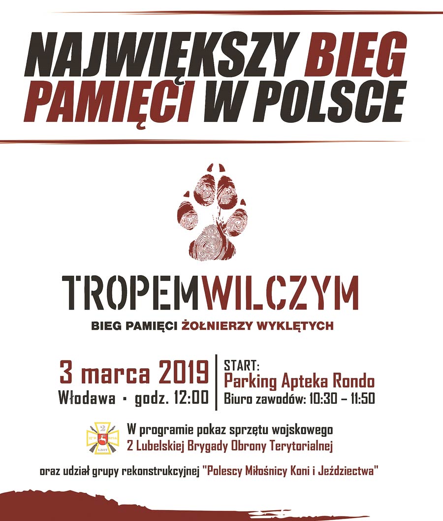 W niedzielę, 3 marca zapraszamy na włodawską edycję projektu pt. „Tropem Wilczym. Bieg Pamięci Żołnierzy Wyklętych”. Ideą projektu biegowo-edukacyjnego „Tropem Wilczym. Bieg Pamięci Żołnierzy Wyklętych” jest oddanie hołdu żołnierzom polskiego podziemia antykomunistycznego i antysowieckiego działającego w latach 1944 -1963.