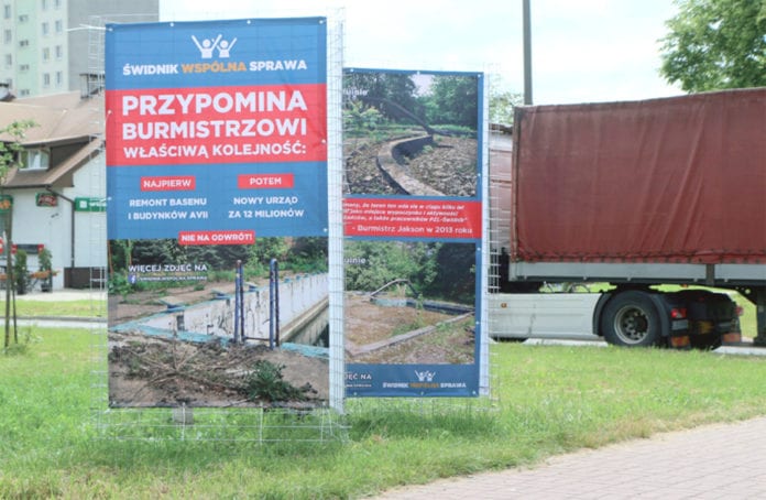 W minionym tygodniu w kilku punktach miasta zostały umieszczone plakaty i bilbordy ze zdjęciami zniszczonych obiektów Avii. Podpisało się pod nimi stowarzyszenie Świdnik Wspólna Sprawa. „Dziś – w Dniu Dziecka przedstawiamy na wystawie plenerowej w Świdniku aktualny stan basenu i budynków Avii Świdnik. Od lat słyszymy obietnice o przywróceniu im dawnej świetności. Tymczasem burmistrz Jakson wydaje niemal 12 000 000 złotych na swoją nową siedzibę. Wspomniana kwota to jedynie część wydatków, jakie przyjdzie nam – podatnikom jeszcze ponieść, ponieważ nie przewidziano w niej żadnego wyposażenia. Ile jeszcze przyjdzie nam dopłacić do nowej siedziby burmistrza i jego świty? Nie tak dba się o Mieszkańców Świdnika. Tak wije się gniazdko pychy dla własnego komfortu” – można przeczytać na plakatach.