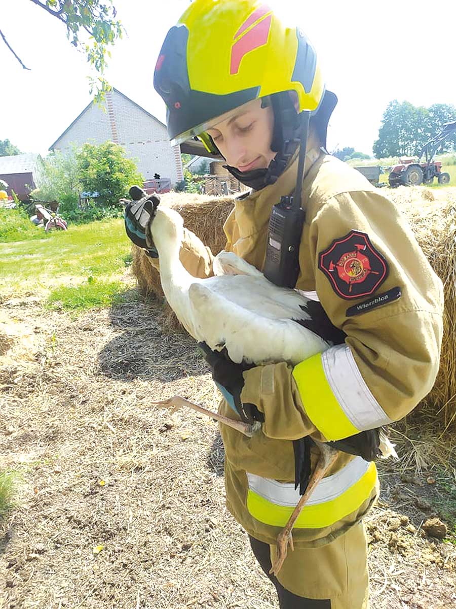 Młody bocian wypadł z gniazda na słupie. Z pomocą biedakowi ruszyli strażacy-ochotnicy.