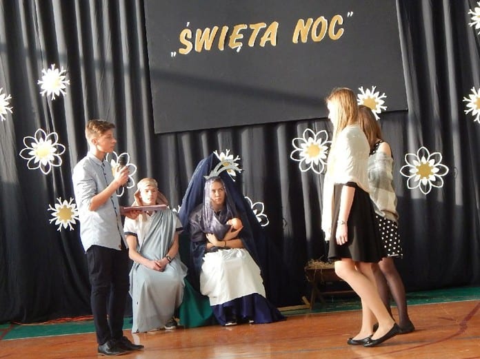 Na początku dyrektor ZS nr 5 Justyna Haładyj wprowadziła społeczność szkolną w bożonarodzeniowy nastrój. Później uczniowie gimnazjum wraz z Marzeną Tymicką przedstawili jasełka pt. „Wigilijna ulica”. Małgorzata Dzik wzbogaciła spotkanie koncertem piosenek bożonarodzeniowych przygotowanych przez uczniów Piątki. Ks. Michał Szadziuk odczytał fragment Pisma Świętego o narodzeniu Jezusa. Na koniec cała społeczność szkolna połamała się opłatkiem. Podczas spotkania uczniowie i nauczyciele pożegnali odchodzącą na emeryturę Teresę Szymaniak. (k)
