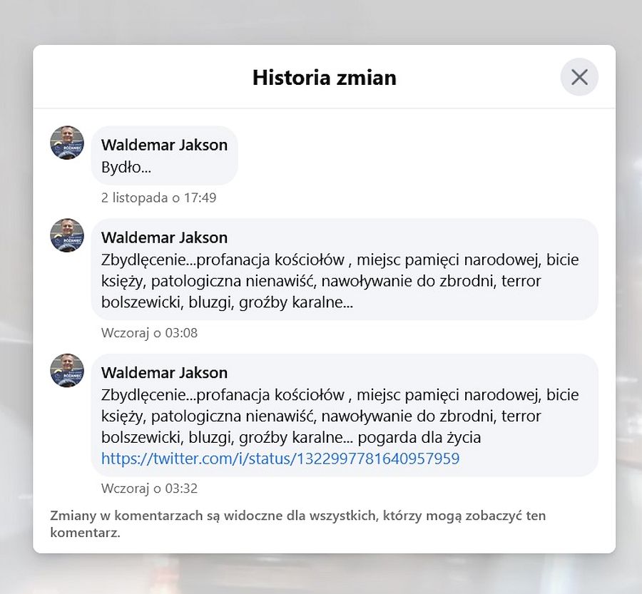 – „zbydlęcenie… profanacja kościołów, miejsc pamięci narodowej, bicie księży, patologiczna nienawiść, nawoływanie do zbrodni, terror, terror bolszewicki, bluzgi, groźby karalne…” – napisał burmistrz, dołączając również link do filmu z agresywnie i wulgarnie zachowującymi się protestantami.