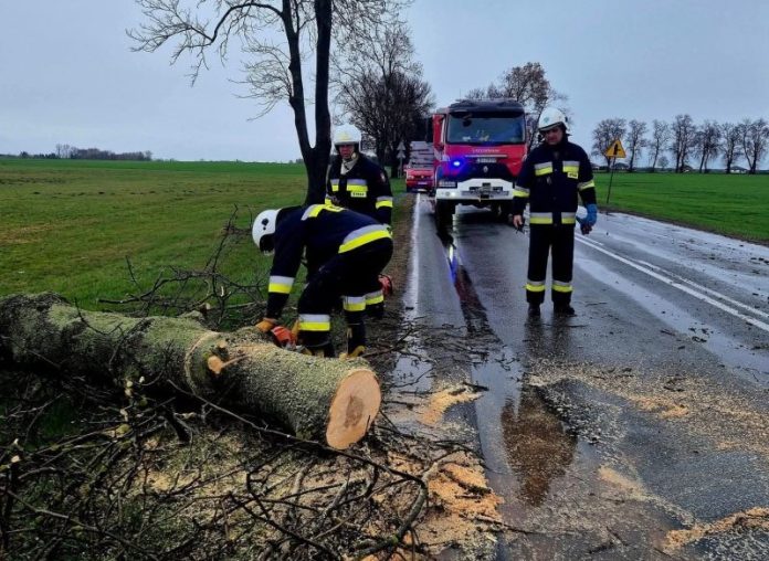 Niespokojnie wyglądał wielkanocny poniedziałek w naszym regionie. Silny wiatr, deszcz i miejscami grad spowodowały mnóstwo problemów dla mieszkańców i służb. Najwięcej szkód było w Różance (gmina Włodawa), gdzie uszkodzone zostały dwa domy. Wiatr zerwał tam część dachów. Podobna sytuacja miała miejsce w Mariance (gmina Stary Brus). Tam ucierpiał jeden budynek. Niebezpiecznie było też na drogach. W Rejowcu powalone drzewo zablokowało drogę wojewódzką nr 812. Przejazd był niemożliwy do czasu usunięcia przeszkody przez strażaków. W wielu miejscowościach zabrakło też prądu. To efekt uszkodzonych linii energetycznych przez drzewa i konary przewrócone na linie pod naporem wiatru. Tylko między godziną 8 a 10 strażacy z jednostek OSP z terenu powiatu włodawskiego wyjeżdżali do zdarzeń aż 14 razy. Najczęściej usuwali powalone drzewa i zabezpieczali uszkodzone dachy. Akcje utrudniała też pogoda. Padał deszcz, chwilami także grad. (bm, Fot. KW PSP w Lublinie)