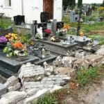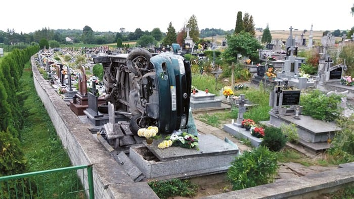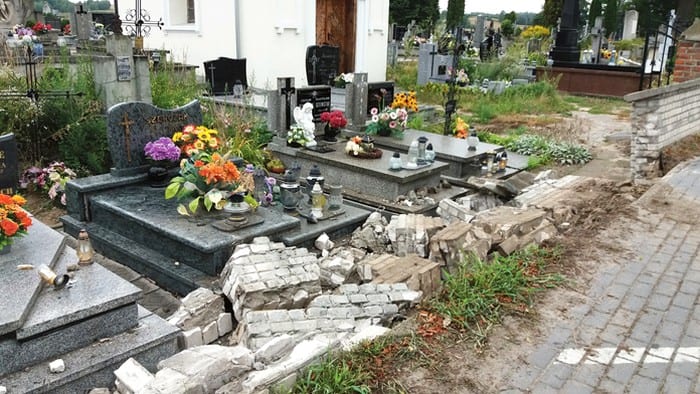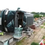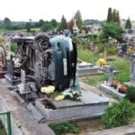 Tego jeszcze nie było! Kierowcę dostawczego busa poniosła fantazja, stracił panowanie nad kierownicę i wjechał na cmentarz w Gorzkowie, uszkadzając po drodze ok. 10 grobów. O dziwo nic mu się nie stało.