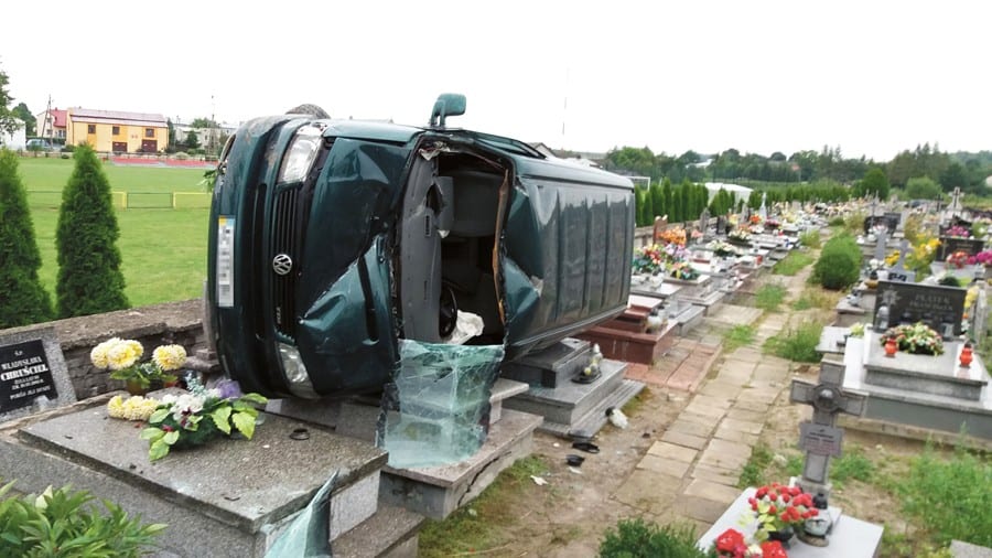 Do nietypowego zdarzenia doszło w Gorzkowie w poniedziałek nad ranem. Kierujący dostawczym Volkswagenem 44-latek z Ukrainy na łuku drogi stracił panowanie nad autem, zjechał z drogi i uderzył w parkan cmentarza. W efekcie samochód wzbił się w powietrze, przeleciał nad ogrodzeniem i zatrzymał się na kilku nagrobkach. W sumie auto uszkodziło ok. 10 grobów. – Kierujący był trzeźwy. Z uwagi na to, że 44-latek nie miał stałego miejsca pobytu w Polsce, jeszcze tego samego dnia został doprowadzony do Sądu Rejonowego w Zamościu, który ukarał go grzywną – mówi Piotr Wasilewski, rzecznik krasnostawskiej policji. Mieszkańcy Gorzkowa zauważają, że to cud, iż szaleńcza jazda Ukraińca skończyła się jedynie zniszczeniem cmentarza. – W miejscu, w którym ten bus wypadł z szosy, jest parking i wejście na nekropolię. Aż strach pomyśleć, co by było, gdyby akurat w tym momencie ktoś chciał odwiedzić groby swoich bliskich – mówi nam jeden ze świadków zdarzenia. Mężczyzna podkreśla, że przy wjeździe do Gorzkowa, a to tam doszło do kolizji, stoi znak ograniczający prędkość do 40 km/h. – Po raz kolejny apelujemy do kierowców o bezwzględne stosowanie się do przepisów ruchu drogowego, rozwagę i ostrożność – podsumowuje Wasilewski. (kg, fot. ps)
