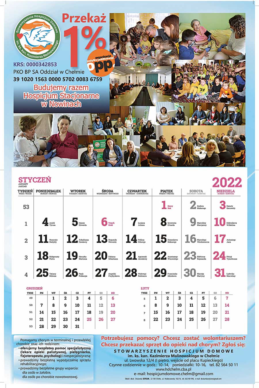 Stowarzyszenie Hospicjum Domowe im. ks. kan. Kazimierza Malinowskiego w Chełmie podobnie jak w poprzednich latach, wydało ścienny kalendarz na rok 2022. Całkowity zysk z jego sprzedaży zostanie przeznaczony na pomoc podopiecznym Hospicjum i prace przygotowawcze do budowy Centrum Wsparcia Hospicyjno-Opiekuńczego w Nowinach koło Chełma.
