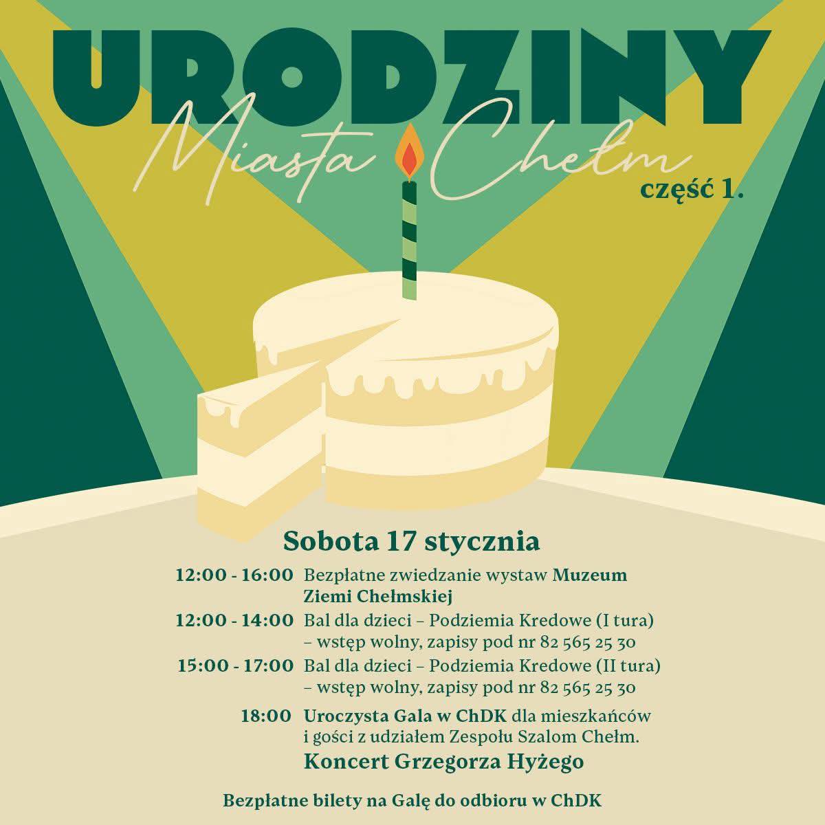 Chełm coraz huczniej obchodzi swoje urodziny i to wcale nie te okrągłe. Świętowanie każdej rocznicy nadania naszemu miastu praw miejskich przez króla Władysława Jagiełłę 14 stycznia 1392 roku wprowadzono przed dwoma laty, a impreza z każdym rokiem się rozkręca. W tym, oprócz tradycyjnego bezpłatnego zwiedzania wystaw Muzeum Ziemi Chełmskiej od godziny 12 do 16 i balu dla najmłodszych w Chełmskich Podziemiach Kredowych (odbędzie się w dwóch turach od godz. 12 do 14 i od 15 do 17 – już nie ma wolnych miejsc, limit zapisów wyczerpał się momentalnie) i gali, na której wystąpi m.in. Zespół Szalom Chełm, będzie też koncert gwiazdy. Wystąpi Grzegorz Hyży z zespołem. Wstęp na wszystkie wydarzenia bezpłatny, ale na galę trzeba pobrać wejściówkę w kasie ChDK.