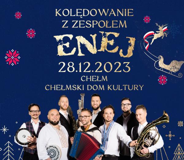 28 grudnia o godz. 19.00 w Chełmskim Domu Kultury wystąpi zespół „Enej”. Muzycy na kilka dni przed świętami Bożego Narodzenia wyruszają w kolejną świąteczną trasę koncertową po całej Polsce. Zagrają najpiękniejsze, najbardziej znane i najbliższe naszym sercom polskie kolędy oraz pastorałki w ich autorskich aranżacjach. Po koncercie ma być okazja do wspólnego zdjęcia i do rozmowy z artystami. Bilety w cenie 95 zł.