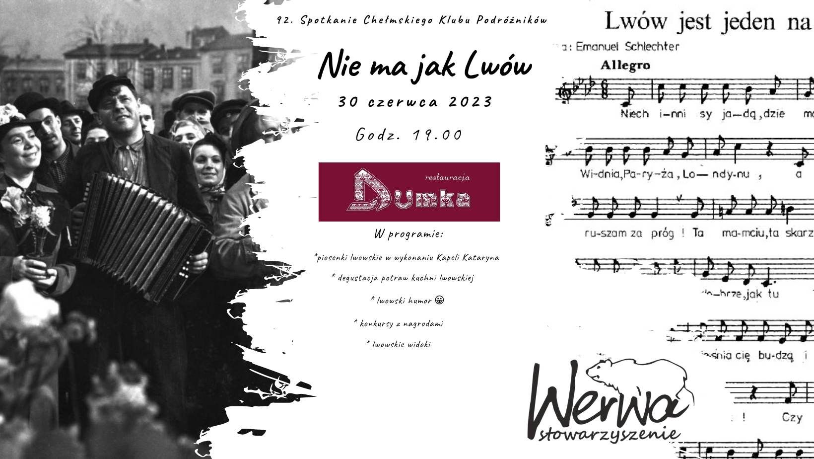 Stowarzyszenie WeRwA zaprasza na 92. spotkanie Chełmskiego Klubu Podróżników, które odbędzie się pod hasłem „Ni ma jak Lwów”. Ten swoisty wieczór lwowski rozpocznie się 30 czerwca o godz. 19:00 w restauracji Dumka. W programie koncert kapeli Kataryna, humor lwowski, degustacja polskich, ukraińskich i żydowskich potraw, zdjęcia i filmiki oraz konkurs wiedzy o Lwowie. Więcej o imprezie na profilu Stowarzyszenia WeRwA i Chełmskiego Klubu Podróżników. GG