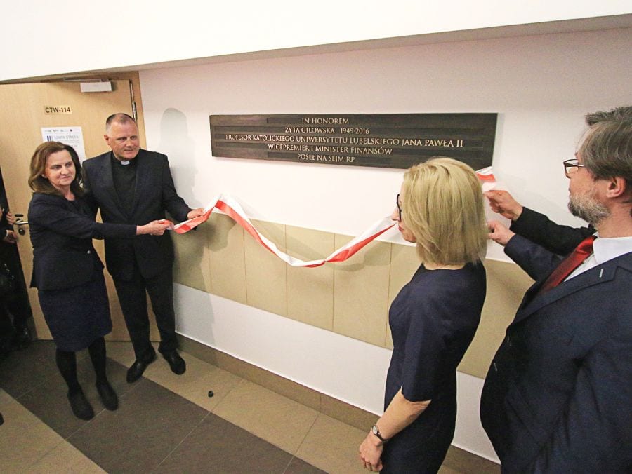 Uroczystego nadania imienia auli i odsłonięcia poświęconej śp. profesor Zycie Gilowskiej tablicy dokonali wspólnie: jej syn Paweł Gilowski, minister finansów prof. Teresa Czerwińska, prezes ZUS, prof. Gertruda Uścińska, oraz rektor KUL, ks. prof. Antoni Dębiński. – Profesor Zyta Gilowska cechowała się szczególną odwagą, podejmowała nietuzinkowe decyzje. Była dla nas wzorem – podkreślała prof. Teresa Czerwińska, obecna szefowa resortu finansów.