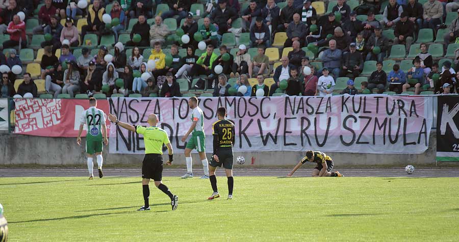 „Nasza tożsamość. Nasza kultura – Nie dla skweru Szmula” – banner z takim hasłem zawisł na trybunach podczas sobotniego meczu (28 maja) Chełmianki z Siarką Tarnobrzeg. W ten sposób kibice naszej lokalnej drużyny chcieli wyrazić swój sprzeciw wobec realizowanej właśnie przez miasto inwestycji – budowy nowego skweru i muralu poświęconego Szmulowi Zygielbojmowi.