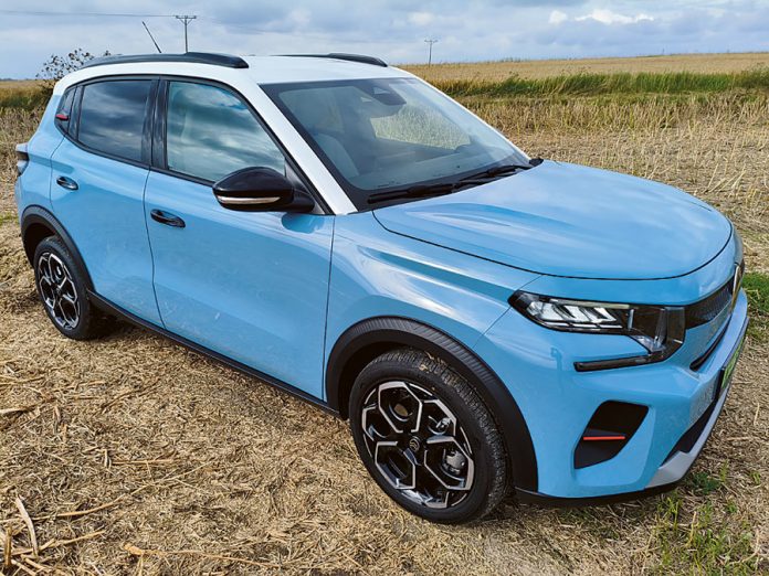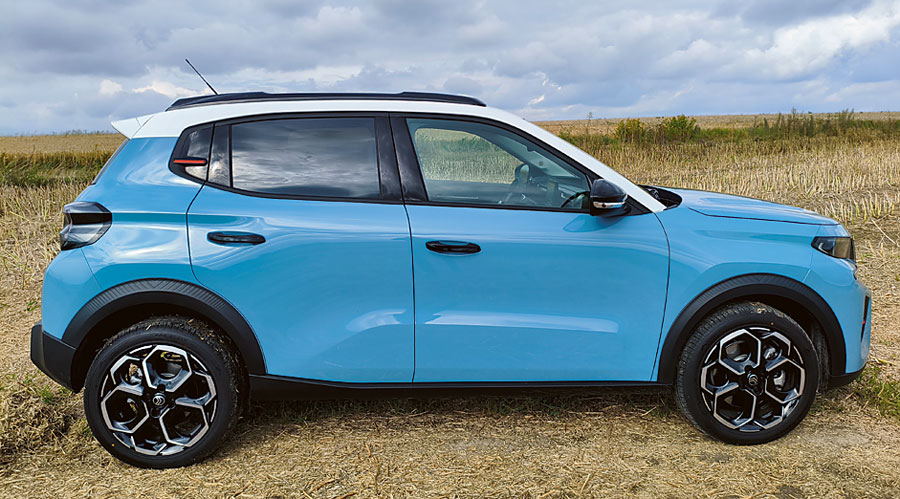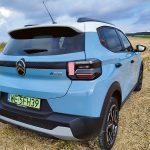 Citroën e-C3 przyciąga wzrok zgrabnym nadwoziem w stylu miejskiego crossovera. Kompaktowe rozmiary (około czterech metrów długości) czynią go zwrotnym i poręcznym, ale to osiągnięto kosztem miejsca na pokładzie, którego brakuje szczególnie na nogi w tylnym rzędzie siedzeń. Wysoki prześwit i charakterystyczna sylwetka nadają kojarzą się bardziej z terenówką niż miejskim hatchbackiem.