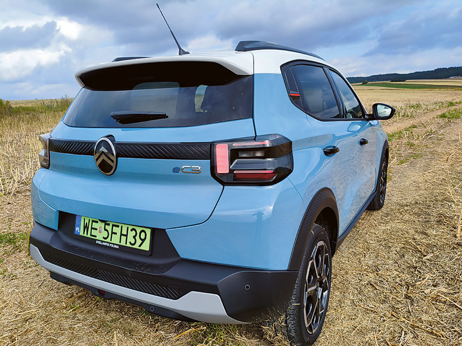 Jednym z największych atutów Citroëna e-C3 jest komfort jazdy. Producent wyposażył go w zawieszenie z progresywnymi ogranicznikami hydraulicznymi, które skutecznie tłumi nierówności nawierzchni. Auto prowadzi się miękko i spokojnie, co docenią szczególnie mieszkańcy miast z drogami gorszej jakości. Na zakrętach samochód zachowuje się przewidywalnie, choć nie zachęca do dynamicznej jazdy. To auto stworzone do relaksującego podróżowania, nie do szaleństw za kierownicą. Warto dodać, że wyciszenie kabiny jest na przyzwoitym poziomie, choć na większych nierównościach można usłyszeć pracę zawieszenia i lekkie skrzypienia plastików.