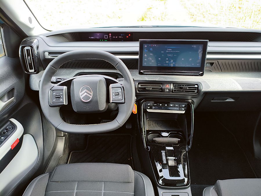 Elektryk od Citroena dostępny jest w dwóch wersjach wyposażenia: You oraz Max. W podstawowej wersji kierowcy znajdą m.in.: LED-owe reflektory, tylne czujniki parkowania, tempomat, manualną klimatyzację oraz zintegrowany uchwyt na smartfon pełniący rolę centrum multimedialnego. Wersja Max, czyli nasza testówka, oferuje więcej: 10-calowy ekran dotykowy, automatyczną klimatyzację, kamerę cofania, ładowarkę indukcyjną do telefonu oraz bardziej dopracowane detale wnętrza.