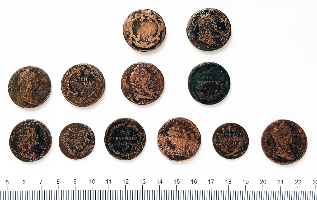 Wśród nich znalazły się głównie krajcary lub inne emisje z Cesarstwa Austriackiego, a także, co szczególnie istotne dwie monety oznaczone napisem „1 GROSSVS POL” wybijane w Wiedniu dla potrzeb zdobytej kosztem RP w I rozbiorze Wschodniej Galicji i Lodomerii, z datą emisji 1794 (czyli roku wybuchu powstania kościuszkowskiego).