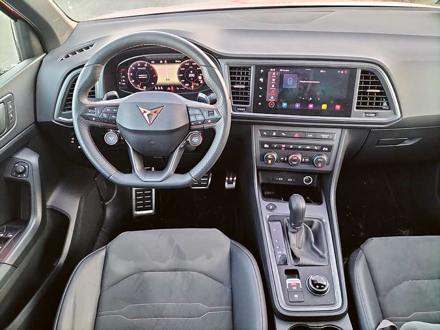 Co różni Cuprę Atecę od zwykłej wersji? Oprócz mocy i właściwości jezdnych są to zupełnie różne zderzaki, spojler na końcu dachu, wielkie koła, cztery końcówki wydechu oraz emblematy Cupra na nadwoziu. Gabarytowo to zwykły klasyczny crossover z wysoko poprowadzoną maską i ostro opadającą tylną klapą. Wnętrze budzi nieco mieszane odczucia – z jednej strony jest wykończone „na bogato”: alcantara, skóra, żółte przeszycia i aluminiowe wstawki oraz nakładki na pedałach, czy wielki wyświetlacz na środku deski rozdzielczej robią wrażenie.