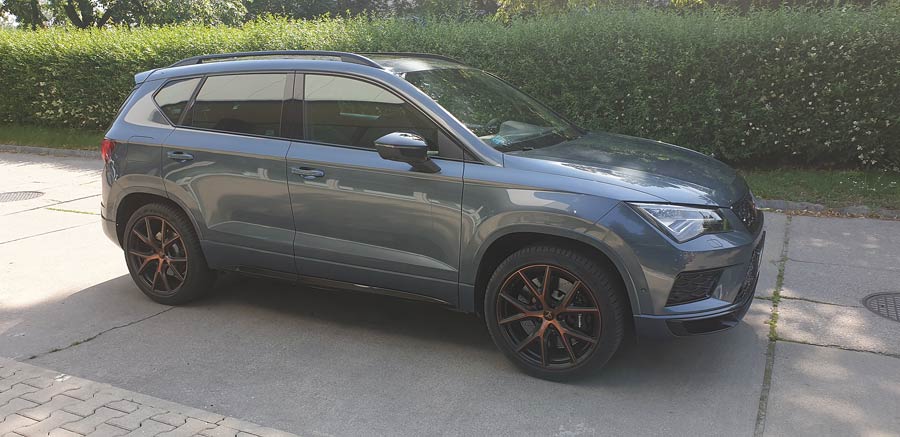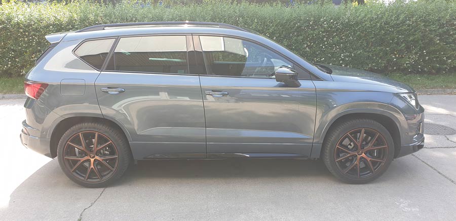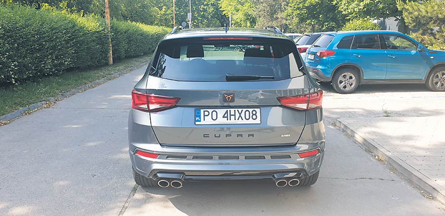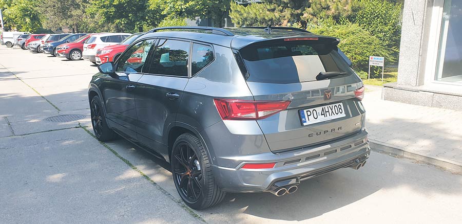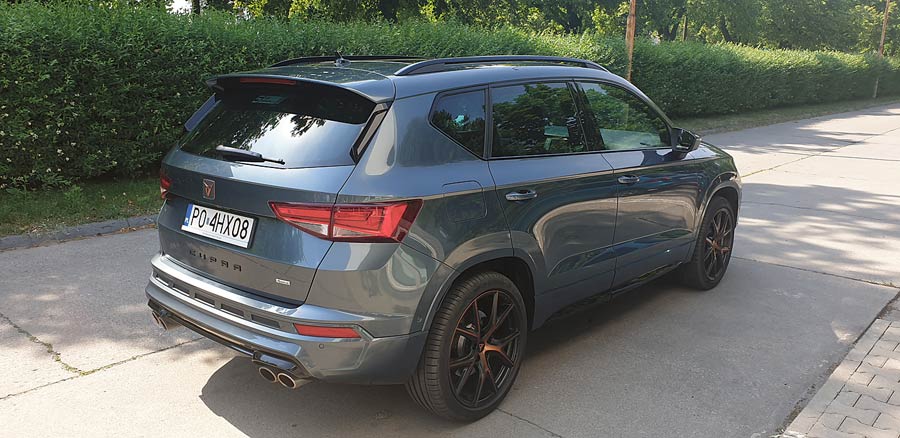 Co różni Cuprę Atecę od zwykłej wersji? Oprócz mocy i właściwości jezdnych sa to zupełnie różne zderzaki, spojler na końcu dachu, wielkie koła, cztery końcówki wydechu oraz emblematy Cupra na nadwoziu. Gabarytowo to zwykły klasyczny crossover z wysoko poprowadzoną maską i ostro opadającą tylną klapą.
