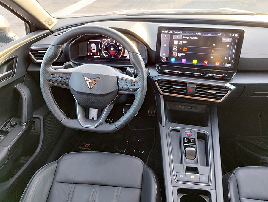 Już z daleka widać i czuć, że Cupra to nie jest zwykłe kombi, choć akurat w tym przypadku wygląd jest nieco zwodniczy. Złote „rogate” emblematy, takie same akcenty na 19-calowych felgach, wielki spojler na dachu, zadziornie wysunięty zderzak i przede wszystkim kapitalny matowy lakier w grafitowym kolorze nakazują podchodzić do tego samochodu z należnym respektem, choć okazuje się, że pod maską drzemie „zaledwie” 190 KM. W środku również nie zabrakło sportowych elementów.