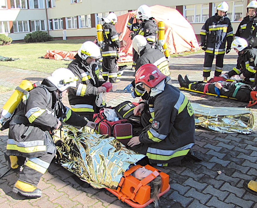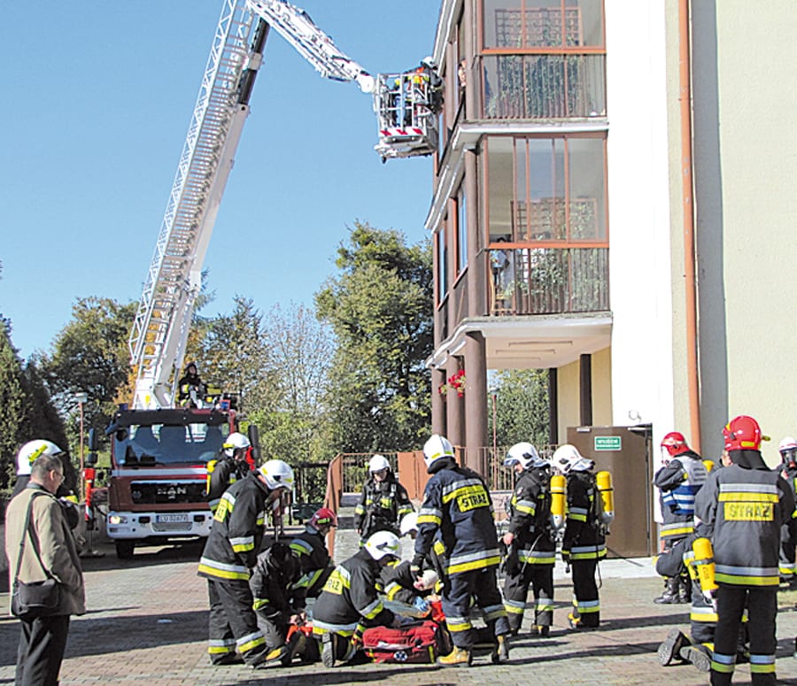 – Te duże ćwiczenia odbywały się na terenie Domu Pomocy Społecznej „Senior” w Różance – mówi mł.bryg. Waldemar Makarewicz z PSP we Włodawie. – Ćwiczyliśmy gaszenie obiektów, w których występuje duża liczba mieszkańców o ograniczonej zdolności poruszania się. Założeniem treningu był pożar we wschodnim skrzydle budynku. Na potrzeby ćwiczeń ewakuowaliśmy pozorantów (w tym piękne panie pielęgniarki z DPS Senior) przy pomocy podnośnika hydraulicznego oraz wydzielonymi pożarowo klatkami schodowymi na deskach jako osoby leżące. Na koniec zbudowaliśmy specjalny namiot pneumatyczny dla osób ewakuowanych. Końcowym elementem działań było sprawdzenie możliwości ratowników w przypadku, gdyby jedna z osób chciała wyskoczyć przez okno. Przećwiczyliśmy sprawienie skokochronu i negocjacje z osobą, która chciała popełnić samobójstwo. W ćwiczeniach brały udział jednostki OSP z Dołhobrody, Żuków, Hanna, Stary Brus, Różanka, Zahajki. Na miejscu była także Policja oraz Wydział Zarządzania Kryzysowego Starostwa Powiatowego we Włodawie – wylicza Makarewicz.