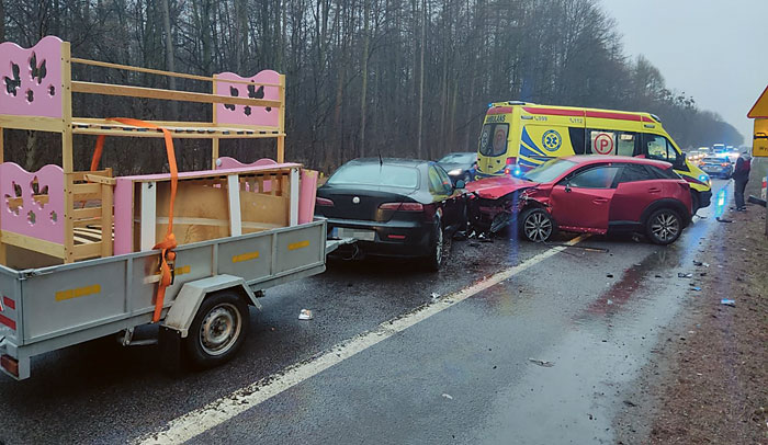 Auto zderzyło się czołową z jadącą w kierunku Lublina skodą, którym podróżował 53-letni mężczyzna, a następnie z Alfą Romeo z załadowaną przyczepką. W wyniku uderzenia skoda wypadła z drogi, kierowca jednak nie odniósł żadnych poważniejszych urazów. Z drobnymi urazami do szpitala zabrane zostały pozostałe dwie kierujące: 69-latka z mazdy oraz 23-latka z alfy. Po badaniach zostały jednak zwolnione, a postępowanie w sprawie kolizji prowadzi chełmska komenda policji. (pc, fot. JRG 2)