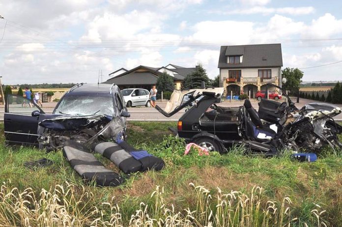 Wykonując ten manewr 35-latek zjechał na przeciwległy pas ruchu, gdzie zderzył się czołowo z jadącym z naprzeciwka passatem, którym jechała rodzina z Chełma. Obydwa pojazdy wypadły z drogi. Kierowca golfa i podróżująca z nim 30-letnia pasażerka zostali zakleszczeni w aucie i konieczne było użycie specjalistycznego sprzętu w celu ich uwolnienia. Obydwoje trafili do szpitala, przy czym kobieta, transportowana była śmigłowcem Lotniczego Pogotowia Ratunkowego.