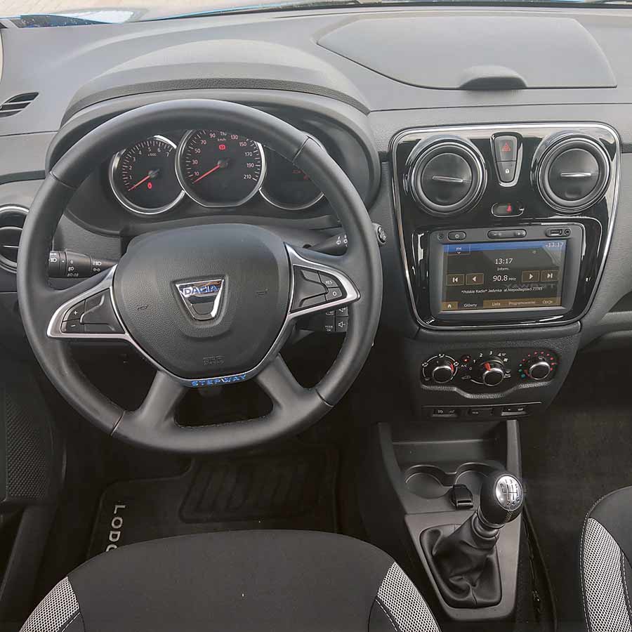 Za obszytą skórą kierownicą znajdziemy trzy tarcze zegarów z prędkościomierzem pośrodku. Największym i niezaprzeczalnym atutem Lodgy jest jednak ilość oferowanej przestrzeni. Tej mamy pod dostatkiem z przodu i w drugim rzędzie siedzeń. Trochę gorzej będą miały dwie osoby podróżujące na składanych fotelach w ostatnim rzędzie. Gdy je zdemontujemy i zostawimy w garażu, Dacia może pochwalić się bagażnikiem o pojemności aż 830 l. Gdy jednak zdemontujemy dwa tylne rzędy, wtedy Lodgy zamienia się we wcale niemałego dostawczaka.