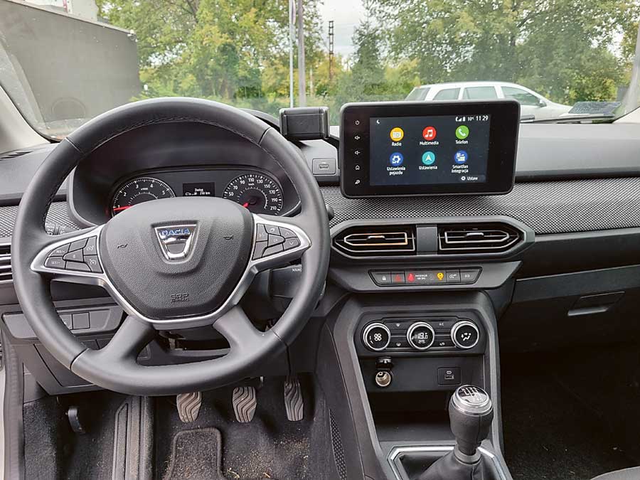 Brawa dla Dacii należą się za dodanie fabrycznego uchwytu na telefon z boku centralnego wyświetlacza i portu USB umieszczonego tuż pod nim. To rozwiązuje problem z plączącymi się kablami i szukaniem miejsca na przenośny uchwyt dla smartfonu. Całe wnętrze Logan dzieli z Sandero, również kierownicę, która ma teraz wszystkie przyciski podświetlane, jest okrągła i bardzo przyjemnie leży w dłoniach.