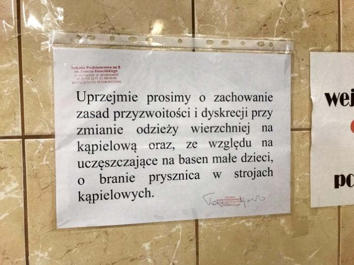 „Uprzejmie prosimy o zachowanie zasad przyzwoitości i dyskrecji przy zmianie odzieży wierzchniej na kąpielową oraz, ze względu na uczęszczające na basen małe dzieci, o branie prysznica w strojach kąpielowych” – ogłoszenie o takiej treści zawisło niedawno w męskiej szatni basenu przy SP nr 5.