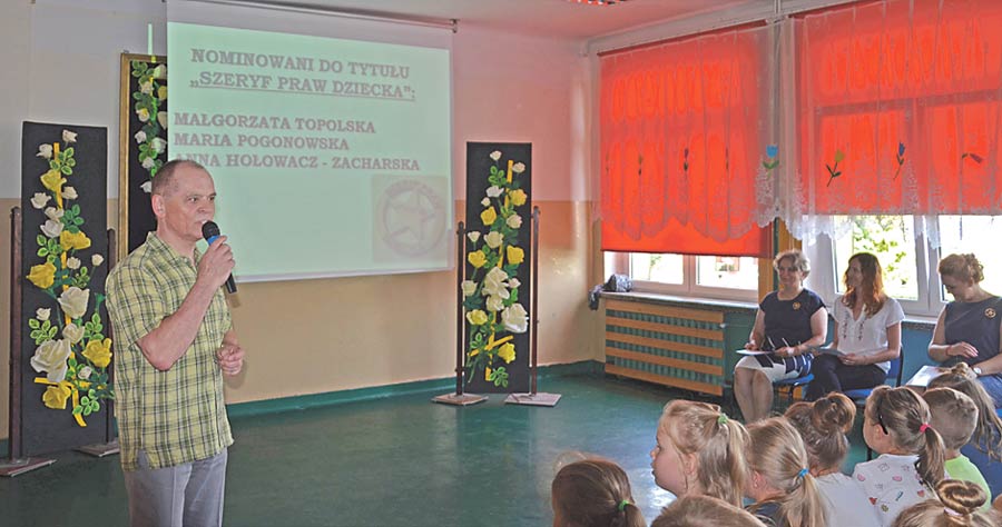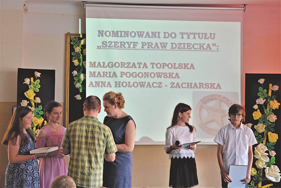 Przeprowadzono głosowanie, podczas którego uczniowie wybrali trzy osoby nominowane do odznaczenia „Szeryf Praw Dziecka”. Nominowani zostały: Maria Pogonowska, Małgorzata Topolska i Anna Hołowacz–Zacharska. Uczniowie z S.U. oraz klasy VI b przygotowali uroczysty apel. Przypomniano w nim najważniejsze prawa dzieci oraz zaprezentowano sylwetki nominowanych.
