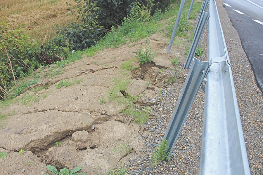 W powietrzu jeszcze czuć zapach nowego asfaltu, a już pobocze drogi w Siedliszczu przegrało starcie z pierwszym większym deszczem. Woda podmyła słupki podtrzymujące ochronną barierkę tworząc wielkie wyrwy.