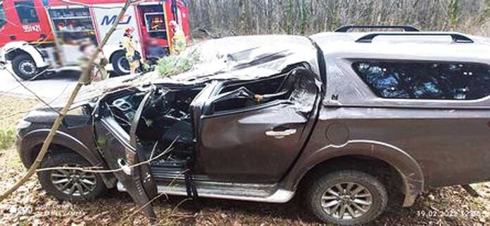 Jedno z nich spadło na jadące drogą wojewódzką między Sobiborem a Orchówkiem (gm. Włodawa) Mitsubishi L200. Okazała sosna runęła wprost na kabinę. Mimo bardzo poważnych uszkodzeń auta, jego kierowca i pasażer zdołali o własnych siłach opuścić pojazd. Pierwszej pomocy udzielili im strażacy, a następnie przekazali załodze karetki pogotowia. Na szczęście osoby te doznały jedynie powierzchownym i niegroźnych obrażeń. (b)