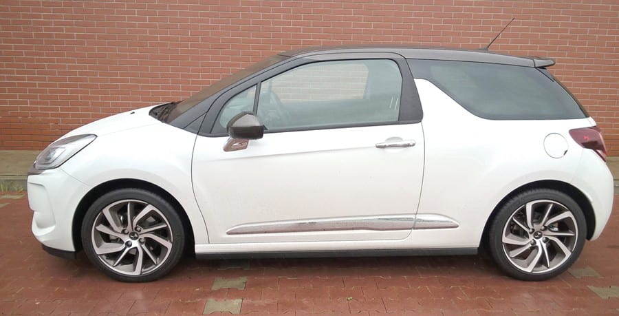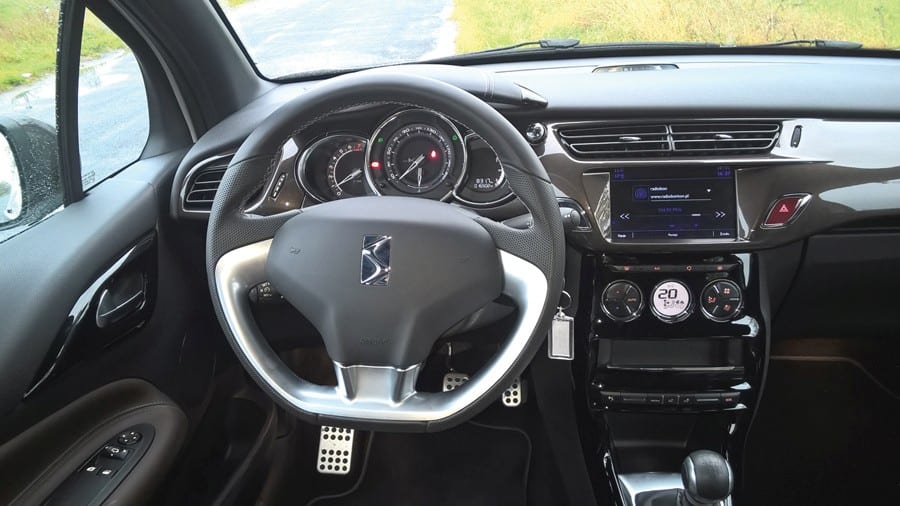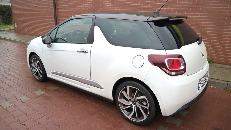 Sylwetka DS3 już na pierwszy rzut oka nie pozostawia wątpliwości, do czego stworzony został ten samochód. Od razu widać, że projektanci popuścili w czasie jego budowy wodze fantazji i stworzyli auto mające nie tylko dawać maksymalną frajdę z jazdy, ale też przykuwające wzrok. Szczególną uwagę zwracają wielkie obręcze kół oraz bardzo agresywny przód z charakterystycznymi, pionowymi światłami LED wkomponowanymi w zderzak. W oczy rzucają się też duże światła, zachodzące wysoko na maskę reflektory oraz nietypowa linia bocznych szyb przywodząca na myśl kabriolety. Tył samochodu jest już jednak dużo bardziej klasyczny, chociaż i tak naszą uwagę absorbuje podwójna końcówka wydechu umieszczona po prawej stronie dyfuzora. Ciekawy i jednocześnie nowoczesny wygląd tego auta podkreślają również: dwukolorowa, czarno-biała karoseria, bardzo ładne lusterka oraz szerokie listwy boczne. Wygląd wnętrza jest zupełnie adekwatny do nadwozia. „Dees” ma sprawiać przyjemność i udaje mu się to znakomicie. Kokpit wygląda oryginalnie a jednocześnie jest funkcjonalny i przyjemny. Mała, ścięta u dołu kierownica z aluminiowymi wstawkami świetnie leży w dłoniach, duży kolorowy wyświetlacz na środku deski rozdzielczej jest bardzo czytelny, a co ważne jego obsługa nie sprawia najmniejszych problemów. Trójwymiarowe zegary w trzech tubach wyglądają niesamowicie, chociaż wrażenie psuje trochę dziwny daszek, pod którym zostały umieszczone. Auto duży plus dostaje za skórzane, trochę usportowione fotele, które dobrze trzymają na zakrętach oraz za ilość miejsca na nogi kierowcy i pasażera siedzącego obok. Niestety, tego samego nie można powiedzieć o tylnej kanapie, gdzie miejsca wystarczy wprawdzie dla dwóch dorosłych osób, ale o komforcie będą one musiały zapomnieć, szczególnie podczas dłuższych tras. Wielkością nie grzeszy również bagażnik, którego pojemność wynosi 275 litrów, ale w tej klasie wynik ten można uznać za zadowalający.