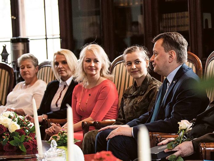 Zebrane panie, w tym zaproszona jako jedyna w woj. lubelskim dyrektor chełmskich „Ekonomów” Edyta Chudoba, odebrały z rąk ministra kwiaty i wyróżnienia. (pc, fot. MON)