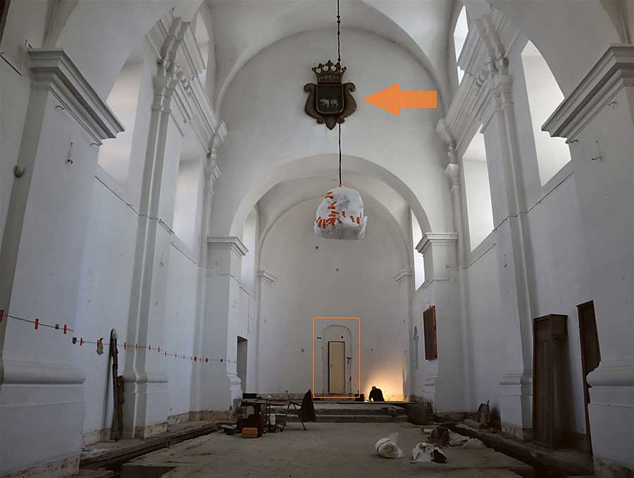 Chełm, cerkiew unicka pw. św. Mikołaja w trakcie prac remontowych. Odsłonięte wejście do kapsuły czasu. Na łuku tęczowym w miejscu oznaczonym strzałką zawieszony był pierwotnie krucyfiks. Po jego zdjęciu umieszczono tam herb Chełma, 2022 r.