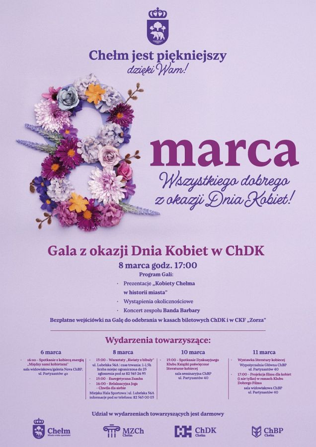 W niedzielę, 8 marca, miasto zaprasza panie na Galę z okazji Dnia Kobiet w ChDK. Początek imprezy o godz. 17.00, a w programie m.in. Prezentacja „Kobiety Chełma w historii miasta, a w finale koncert zespołu Banda Barbary. Bezpłatne wejściówki na Galę do odebrania w kasach biletowych ChDK i CKF „Zorza”.