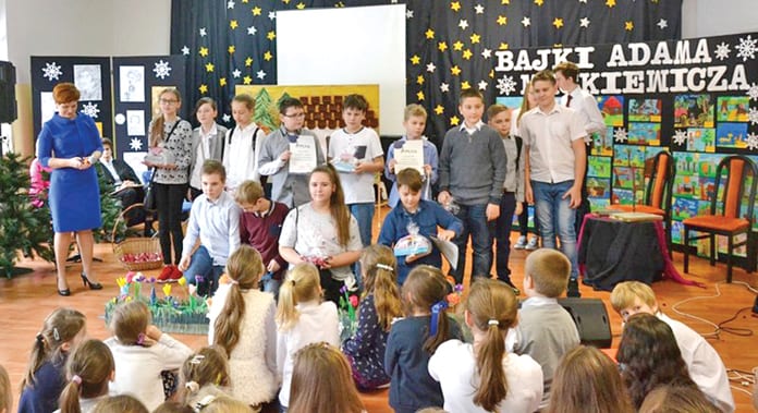 Na uroczystość przybyli m.in. burmistrz Hanna Mazurkiewicz i przewodniczący rady miasta Edward Kawęcki. W sali gimnastycznej zgromadzili się też uczniowie, nauczyciele i rodzice. Burmistrz, dyrektor Marzena Morylowska i przewodniczący Kawęcki wręczali nagrody zwycięzcom Festiwalu Nauki „Będzie się działo”, który odbył się w szkole 29 listopada. Laureatami w szkole podstawowej zostali uczniowie ZS nr 1: Bartosz Żurek (konkurs historyczny), Antonina Oleszczuk (konkurs matematyczny) i Miłosz Ciechan (konkurs przyrodniczy), a w gimnazjum: Maciej Kowalczyk z ZS nr 4 (konkurs fizyczny) oraz uczniowie ZS nr 1: Dominik Pitucha (konkurs historyczny) i Piotr Poniewozik (konkurs matematyczny). W ramach Dnia Patrona rozstrzygnięto też dwa konkursy plastyczne: na najpiękniejszą ilustrację do bajek Mickiewicza (dla klas I – III SP) oraz na najciekawszą i najoryginalniejszą karykaturę wieszcza(dla Gimnazjum). Nagrodzeni otrzymali dyplomy, gry planszowe, słodycze. Najładniejsze ilustracje wykonali: Zuzanna Chrząszcz, Jakub Sabała, Aleksandra Poszytek, Anna Urban, Łucja Paul, Julia Brodaczewska, Martyna Liśkiewicz, Julia Stręfner. Wyróżniono: Filipa Dutkiewicza, Filipa Książka, Nel Popek i Łucję Gruszecką. Nagrodzono też autorki trzech karykatur. Pierwsze miejsce zdobyła Urszula Lasota, drugie Monika Manachiewicz a trzecie Natalia Pomarańska. Wpisując się w akcję narodowego czytania zaproszono chętnych do wspólnej lektury dzieł Mickiewicza. Burmistrz Mazurkiewicz przeczytała bajkę „Przyjaciele” a przewodniczący Kawęcki utwór „Zając i żaba”.