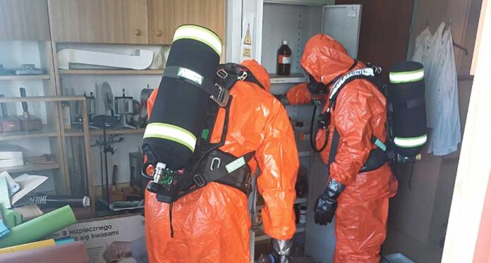 Odczynnik przechowywany był w oryginalnym pojemniku, posiadał wszystkie niezbędne certyfikaty, z datą przydatności do 2023 roku. Niewielka ilość substancji, która wyciekła i weszła w reakcję z metalem, nie stanowiła zagrożenia dla uczniów. Jednak akcja, w której oprócz specjalistycznych grup z Zamościa i Lublina brało udział osiem zastępów chełmskiej straży, trwała bardzo długo. Działania zakończyły się przed godziną 19. Następnego dnia sala chemiczna oraz sąsiednia były wyłączone z użytkowania i sprzątane. (pc, fot. PSP Chełm)