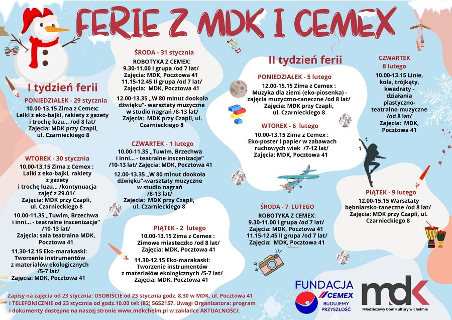 10.00-13.15 Pakiet/ Zima z Cemex : Eko-poster i papier w zabawach ruchowych wiek /7-12 lat/ MDK, Pocztowa 41 ; 10.00-13.15 Zajęcia doskonalące Orkiestra Wszystko Gra, ukulele, bębniarskie /MDK przy Czapli, ul. Czarnieckiego 8 (sala nr 27) – pierwszeństwo uczestnictwa wychowankowie MDK; 12.00-15.15 Warsztaty nauki gry na keyboardzie (Demex) /MDK, Pocztowa 41 – pierwszeństwo uczestnictwa wychowankowie MDK; 11.00-11.45 Warsztaty taneczne grupy Fresh Boogie Twist II /MDK, Pocztowa 41 – pierwszeństwo uczestnictwa wychowankowie MDK; 11.50-12.35 Warsztaty taneczne grupy Fresh Boogie Twist II /MDK, Pocztowa 41 – pierwszeństwo uczestnictwa wychowankowie MDK; 10.00-13.15 Warsztaty teatralno-wokalne grup Studio Teatru Wyobraźni i Piosenka w Teatrze /sala muzyczna i sala teatralna MDK, Pocztowa 41 – pierwszeństwo uczestnictwa wychowankowie MDK; 12.35-15.00 Warsztaty plastyczne w Plastelowni /MDK, Pocztowa 41 – pierwszeństwo uczestnictwa wychowankowie MDK;